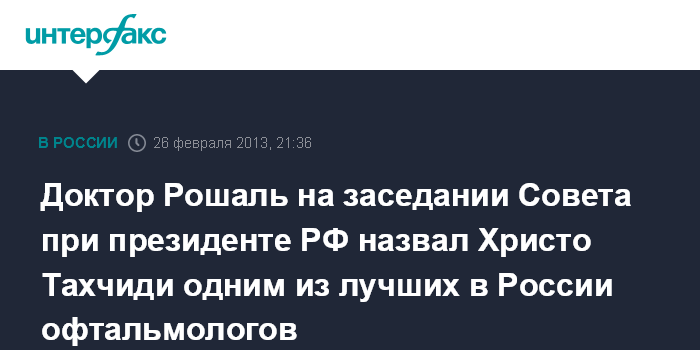 Ново-Огарево. 26 февраля. INTEFAX.RU - Директор НИИ неотложной детской хирургии и травматологии Леонид Рошаль на заседании Совета при президенте РФ по реализации приоритетных нацпроектов и демографической политике поднял вопрос о ситуации вокруг известного российского окулиста Христо Тахчиди. "Хочу вам сказать, что уже полтора года не работает один из лучших российских окулистов, человек с мировым именем, член-корреспондент Российской академии медицинских наук Христо Тахчиди, которого оболгали", - заявил Рошаль во вторник на проходящем в Ново-Огарево заседании Совета.
