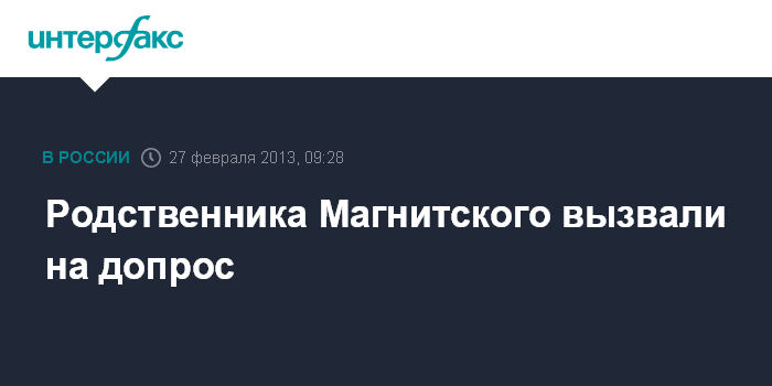 "Вызываемому в качестве свидетеля родственнику предложено "прибыть для допроса" в здание Следственного департамента МВД в Газетном переулке, туда же, куда свыше четырех лет назад, 24 ноября 2008 года, был доставлен Сергей Магнитский", - говорится в сообщении пресс-службы, поступившем в среду в "Интерфакс".