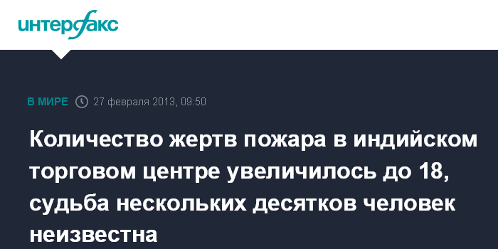 Дели. 27 февраля. INTERFAX.RU - Пожар, произошедший в торговом центре в индийском городе Колката (Калькутта), привел к гибели не менее 18 человек, еще двое пострадали, сообщает в среду агентство EFE.