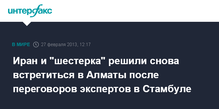 Тегеран. 27 февраля. INTERFAX.RU - Представители Ирана и "шестерки" международных посредников (постоянные члены СБ ООН и ФРГ) договорились провести новые переговоры в Алматы после консультаций экспертов в Стамбуле, сообщает иранское агентство ФАРС.