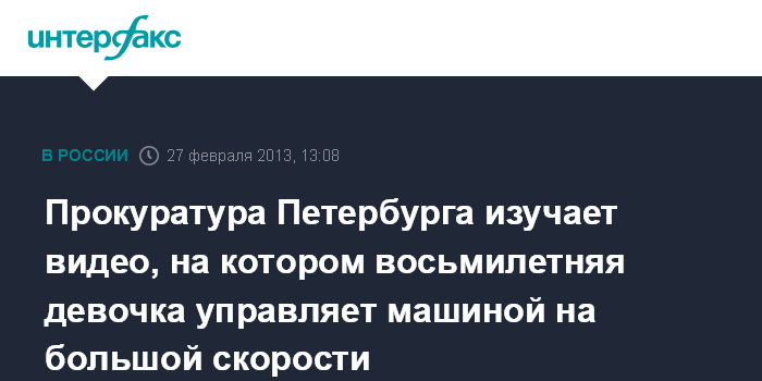 Санкт-Петербург. 27 февраля. INTERFAX.RU - Прокуратура Санкт-Петербурга инициировала проверку после появления в интернете видеозаписи, на которой восьмилетняя девочка управляет легковым автомобилем.