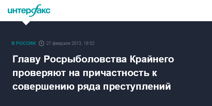 Москва. 27 февраля. INTERFAX.RU - Глава Росрыболовства Андрей Крайний проверятся на причастность к совершению ряда преступлений, сообщил в своем Твиттере официальный представитель СКР Владимир Маркин.