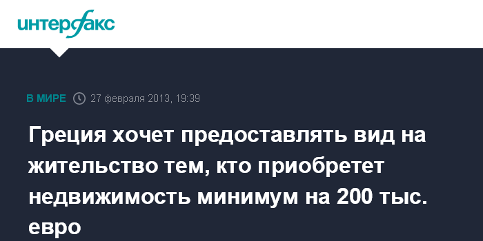 Москва/Афины. 27 февраля. INTERFAX.RU - Греция намерена понизить до 200 тыс. минимальный объем инвестиций в недвижимость, необходимый для получения иностранцем вида на жительство в стране.