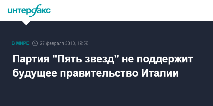 Рим. 27 февраля. INTERFAX.RU - Итальянская партия "Пять звезд" не готова выразить вотум доверия будущему правительству во главе с традиционными партиями, написал в среду на своей страничке в "Твиттере" глава партии, комик и блогер Беппе Грилло.