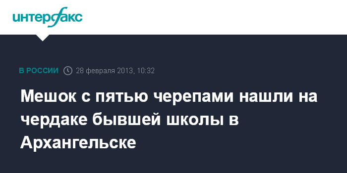 "В среду в 10:45 мск поступило сообщение о том, что на чердаке бывшей художественной школы на улице Логинова, 39 в Архангельске нашли мешок с пятью человеческими черепами", - отметил собеседник агентства.