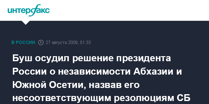Буш осудил решение президента России о независимости Абхазии и Южной Осетии, назвав его несоответствующим резолюциям СБ ООН