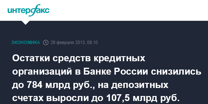 Остатки средств кредитных организаций в Банке России снизились до 784 млрд руб., на депозитных счетах выросли до 107,5 млрд руб.