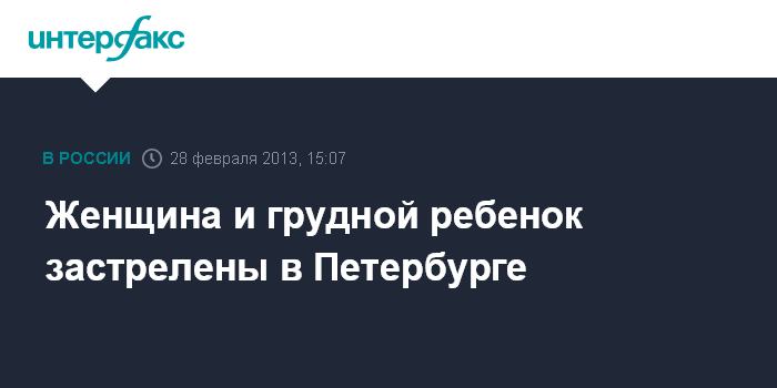 Санкт-Петербург. 28 февраля. INTERFAX.RU - Следственное управление СКР по Петербургу возбудило уголовное дело по факту убийства 33-летней женщины и ее грудного ребенка. Как сообщает пресс-служба ведомства, в четверг днем женщина и ребенок были обнаружены с огнестрельными ранениями в доме по адресу Аэродромная улица, 11 корпус 1.