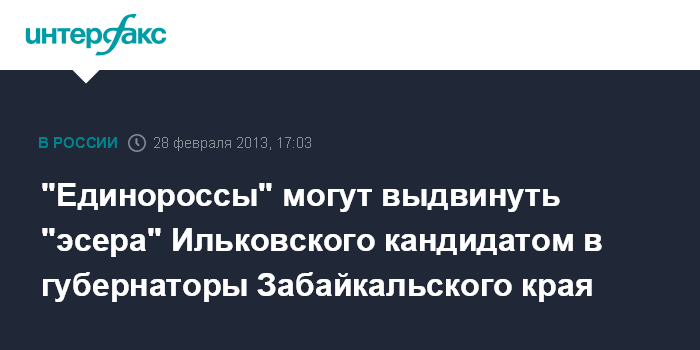 Москва. 28 февраля. INTERFAX.RU - В руководстве "Единой России" не исключают, что выдвинут вместе с общественными организациями кандидатуру Константина Ильковского для участия в выборах губернатора Забайкальского края.