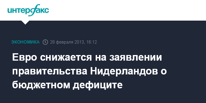 28 февраля. FINMARKET.RU - Евро дешевеет по отношению к большинству мировых валют. Падение евро началось после заявления правительства Нидерландов о том, что бюджетный дефицит страны в 2013-2014 годах будет больше допустимых, согласно общеевропейскому законодательству, 3% ВВП, сообщает агентство Bloomberg.