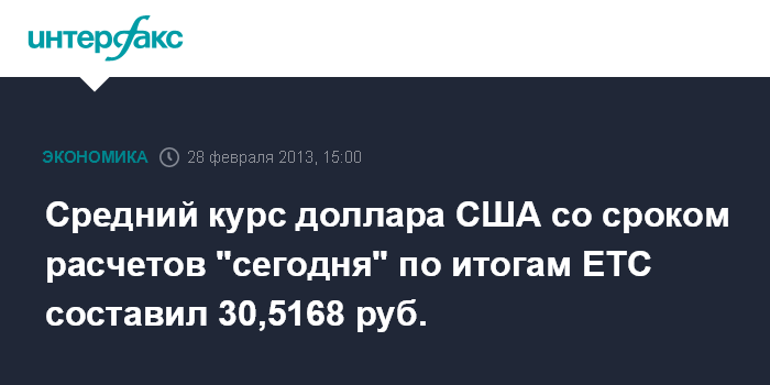 Средний курс доллара США со сроком расчетов "сегодня" по итогам ЕТС составил 30,5168 руб.