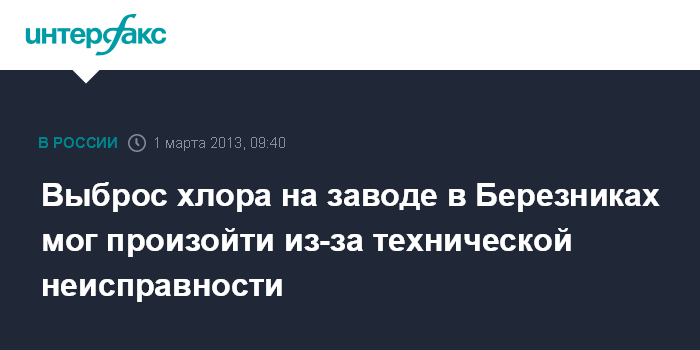 Пермь. 1 марта. INTERFAX.RU - Причиной выброса хлора на предприятии ОО "Сода-хлорат" в Березниках, в результате которой пострадали 30 человек, стала, по предварительным данным, техническая неисправность, сообщает ГУ МВД по Пермскому краю.