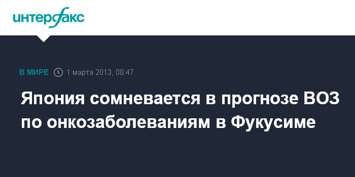 Токио. 1 марта. INTERFAX.RU - Опубликованный почти два года спустя после катастрофы на АЭС "Фукусима-1" доклад Всемирной организации здравоохранения (ВОЗ) по риску развития онкологических заболеваний у жителей наиболее пострадавших от радиации районов вызвал сомнения у министерства окружающей среды Японии, передают в пятницу местные СМИ.