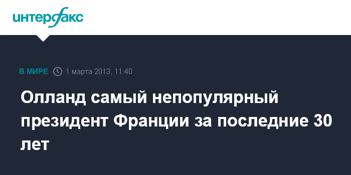 Париж. 1 марта. INTERFAX.RU - Уровень популярности французского президента Франсуа Олланда за десять месяцев его пребывания на посту достиг самого низкого показателя, свидетельствуют результаты опроса, проведенного агентством TNS Sofres для французской газеты Le Figaro.