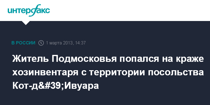 Москва. 1 марта. INTERFAX.RU - Россиянин, работающий в посольстве Кот-д'Ивуара, задержан с поличным при попытке кражи хозяйственного инвентаря с территории дипмиссии, сообщил "Интерфаксу" в пятницу источник в правоохранительных органах.