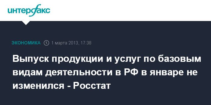 1 марта. FINMARKET.RU - Выпуск продукции и услуг по базовым видам экономической деятельности в РФ в январе 2013 года продемонстрировал нулевой рост по сравнению с январем 2012 года, сообщила в пятницу Федеральная служба государственной статистики РФ (Росстат).