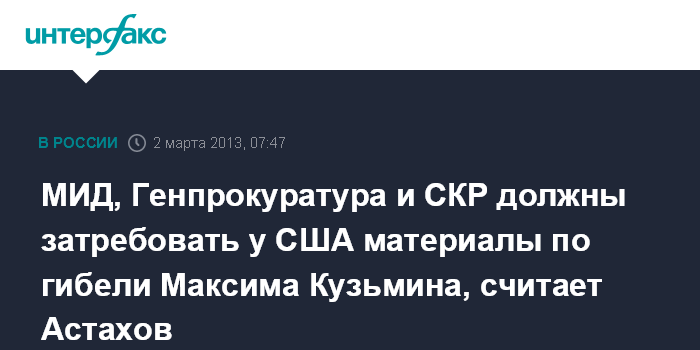 Москва. 2 марта. ИНТЕРФАКС - Уполномоченный по правам ребенка при президенте РФ Павел Астахов призвал российские МИД, Генпрокуратуру и СКР затребовать у США материалы о гибели российского мальчика Максима Кузьмина, усыновленного американской семьей.