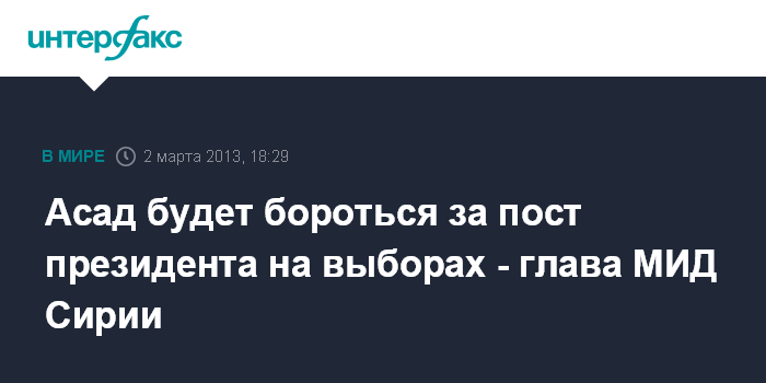 "Президент Б.Асад, как и другие кандидаты, примет участие в будущих выборах. При этом Б.Асад останется у власти до 2014 года, несмотря на призывы ряда западных и арабских стран к тому, чтобы он ушел ради урегулирования конфликта в Сирии", - заявил В.Муаллем на совместной пресс-конференции с иранским коллегой Али Акбаром Салехи.