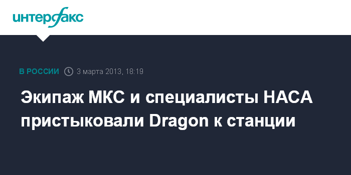 Москва. 3 марта. INTERFAX.RU - Американский частный грузовой космический корабль Dragon, стартовавший в пятницу с космодрома на мысе Канаверал на ракете-носителе Falcon 9, пристыкован в воскресенье к Международной космической станции (МКС). Прямая трансляция стыковки велась на сайте НАСА.