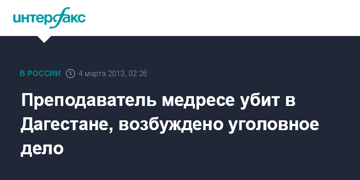 Махачкала. 4 марта. ИНТЕРФАКС-ЮГ - Преподаватель религиозной школы (медресе) Магомед Биярсланов убит в воскресенье вечером в селении Губден Карабудахкентского района Дагестана, сообщили "Интерфаксу" в пресс-службе МВД по республике.