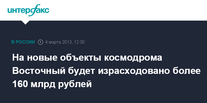Москва. 4 марта. INTERFAX.RU - На строительство объектов космодрома Восточный в Амурской области действующей Федеральной космической программой (ФКП) России в период с 2011 по 2015 гг. включительно запланировано выделение порядка 164 млрд рублей, сообщил "Интерфаксу-АВН" в понедельник источник в ракетно-космической отрасли.По его словам, в 2012 г. бюджетное финансирование составило около 22 млрд рублей".