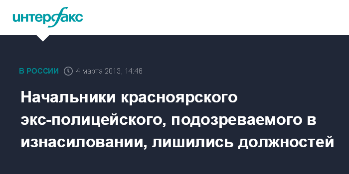Красноярск. 4 марта. INTERFAX.RU - Подозреваемый в изнасиловании инспектор ГИБДД из Ачинска уволен из органов внутренних дел, трое его начальников освобождены от занимаемых должностей, сообщает пресс-служба ГУ МВД России по Красноярскому краю.