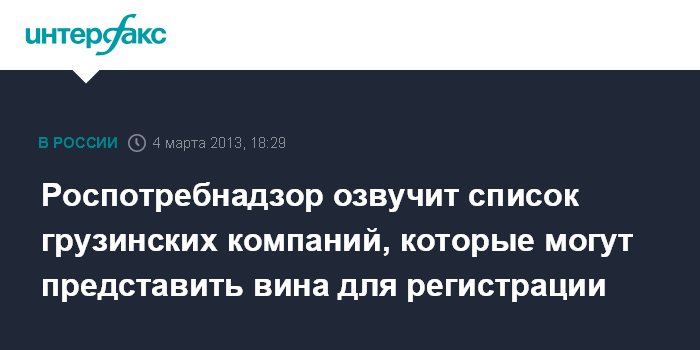 Москва. 4 марта. INTERFAX.RU - Роспотребнадзор планирует во вторник, 5 марта назвать грузинских производителей, которые могут представить образцы вина и минеральной воды для регистрации в РФ и поставок на российский рынок.