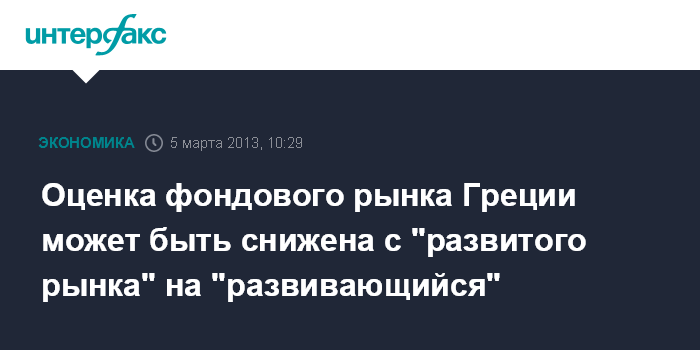 5 марта. FINMARKET.RU - Компания Russell Indexes может снизить классификацию фондового рынка Греции. Компания поставила на пересмотр оценку греческого рынка акций, намереваясь изменить ее с "развитого рынка" на "развивающийся" (emerging).