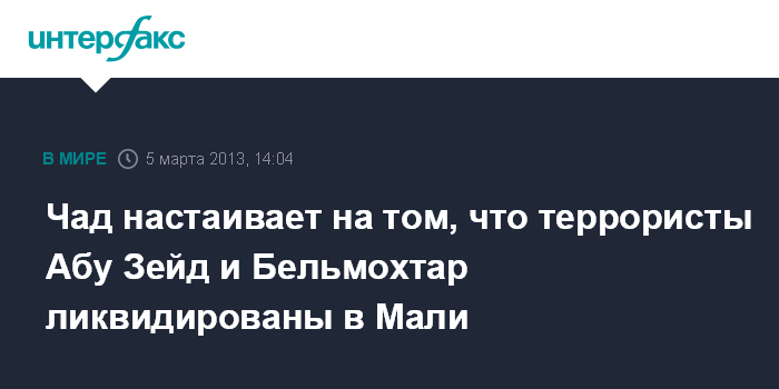 Брюссель. 5 марта. INTERFAX.RU - Президент Чада Идрис Деби вновь подтвердил, что на минувшей неделе в ходе военных операций на севере Мали были уничтожены лидер "Аль-Каиды" в исламском Магрибе Абдельхамид Абу Зейд и организатор захвата заложников в Алжире Мохтар Бельмохтар.