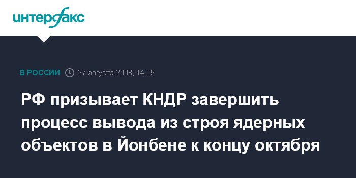Москва. 27 августа. INTERFAX.RU - Москва призывает Пхеньян завершить вывод из строя ядерных объектов в Йонбене к концу октября текущего года.