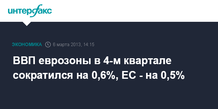 ВВП 27 стран ЕС в четвертом квартале снизился на 0,5% по отношению к предыдущему, когда его рост составил 0,1%. По сравнению с аналогичным периодом прошлого года экономика ЕС упала на 0,6%.