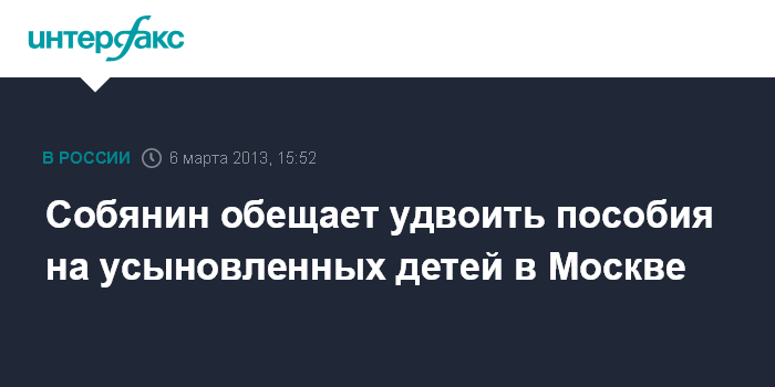 Москва. 6 марта. INTERFAX.RU - Пособия на усыновленных детей в Москве планируется увеличить почти в два раза, сообщил мэр столицы Сергей Собянин в среду на встрече с победителями XIV городского конкурса "Женщина - директор года".