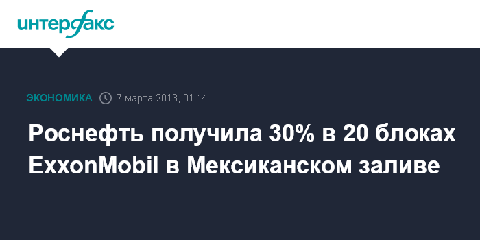 Москва. 7 марта. ИНТЕРФАКС-АНИ - "Роснефть" подписала соглашение с американской ExxonMobil о приобретении 30% доли в проекте по геологическому изучению 20 блоков ExxonMobil в Мексиканском заливе, говорится в сообщении российской компании.