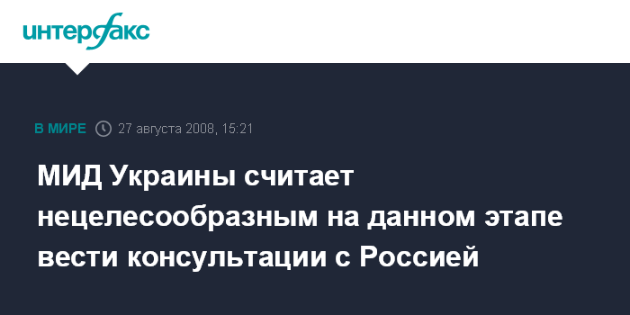 Москва. 27 августа. INTERFAX.RU - Министерство иностранных дел Украины считает нецелесообразным на нынешнем этапе вести консультации с российской стороной и примет решение относительно дальнейшего диалога после анализа дальнейших шагов России в вопросе признания независимости Южной Осетии и Абхазии, заявил министр иностранных дел Украины Владимир Огрызко.