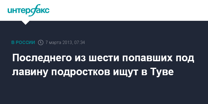 Чита. 7 марта. ИНТЕРФАКС-СИБИРЬ - Спасатели в четверг возобновили поиски последнего из шести подростков, попавших под лавину на горе Ак-Баштагг в Туве, сообщили агентству "Интерфакс-Сибирь" в республиканском ГУ МЧС.