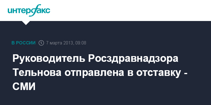 Москва. 7 марта. INTERFAX.RU - Елена Тельнова, возглавлявшая с февраля 2010 г. Федеральную службу по надзору в сфере здравоохранения и социального развития (Росздравнадзор), лишилась своей должности, сообщает сайт газеты "Ведомости".