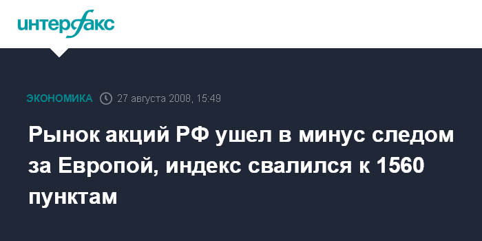 Москва. 27 августа. INTERFAX.RU - Российский рынок акций, поднимавшийся утром выше 1600 пунктов по индексу РТС, к середине торгов ушел "в минус" по большинству blue chips следом за упавшей Европой, индекс РТС свалился к 1560 пунктам.