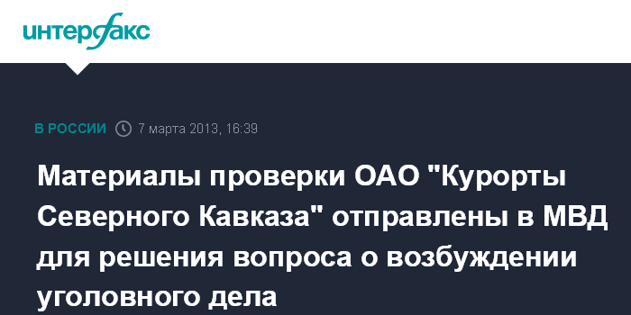 Материалы проверки ОАО "Курорты Северного Кавказа" отправлены в МВД для решения вопроса о возбуждении уголовного дела