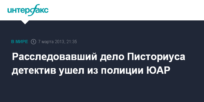 Лондон. 7 марта. INTERFAX.RU - Детектив Хилтон Бота, отстраненный от расследования дела южноафриканского бегуна-паралимпийца Оскара Писториуса, покинул правоохранительные органы, сообщает в четверг британская телерадиокорпораиця BBC.