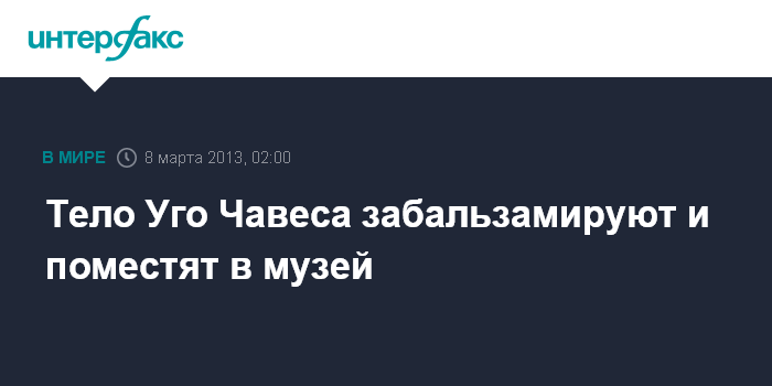 Лондон. 8 марта. INTERFAX.RU - Временно исполняющий обязанности главы государства вице-президент Венесуэлы Николас Мадуро заявил, что тело умершего президента Уго Чавеса будет забальзамировано и выставлено для прощания еще на 7 дней, передает британская телерадиокорпорация Би-Би-Си. Тело покойного лидера Венесуэлы поместят в стеклянный гроб, чтобы, по словам Н.Мадуро, "народ Венесуэлы мог его увидеть".
