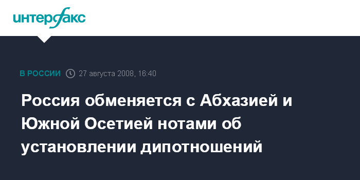 Москва. 27 августа. INTERFAX.RU - Россия намерена в скором времени обменяться нотами с Абхазией и Южной Осетией об установлении дипотношений.