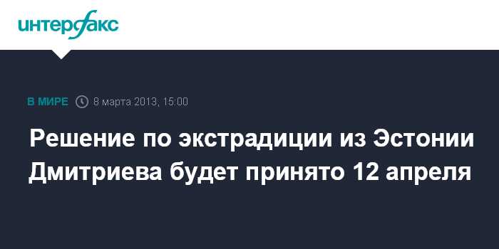 Таллин. 8 марта. INTERFAX.RU - В Эстонии Харьюский (Harju) уездный суд в пятницу рассмотрел вопрос о возможной выдаче Российской Федерации экс-депутата горсовета Омска, бывшего директора омского филиала "АК Барс банка" Александра Дмитриева. Как сообщили "Интерфаксу" в пресс-службе суда, "решение по делу Александра Дмитриева будет принято 12 апреля".