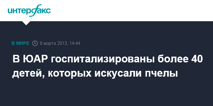 Йоханнесбург. 9 марта. INTERFAX.RU - Более 40 детей попали в больницу в результате нападения пчелиного роя в городе Бенони на северо-востоке ЮАР, сообщил в субботу журналистам представитель местной службы скорой помощи Крис Бота. "Дети ждали автобуса, когда это произошло. Рой пчел вылетел непонятно откуда и напал на них", - сказал он.