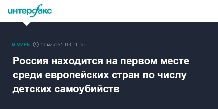 "Сегодня Российская Федерация занимает первое место в Европе по количеству самоубийств среди детей и подростков. За последние годы количество детских суицидов и попыток самоубийств увеличилось на 35-37%. Всего же в период с 1990 по 2010 гг. в России было зарегистрировано около 800 тыс. самоубийств", - сообщил сайт Роспотребнадзора в понедельник.