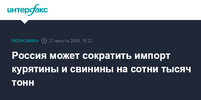 Москва. 27 августа. INTERFAX.RU - Квоты на ввоз в Россию мяса птицы и свинины могут быть сокращены на сотни тысяч тонн, заявил глава Минсельхоза РФ Алексей Гордеев.