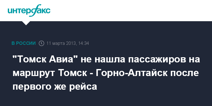 Томск. 11 марта. INTERFAX.RU - Авиакомпания "Томск Авиа" в минувшую пятницу совершила первый регулярный рейс из Томска в Горно-Алтайск, и после этого отменила два рейса по маршруту из-за отсутствия пассажиров.