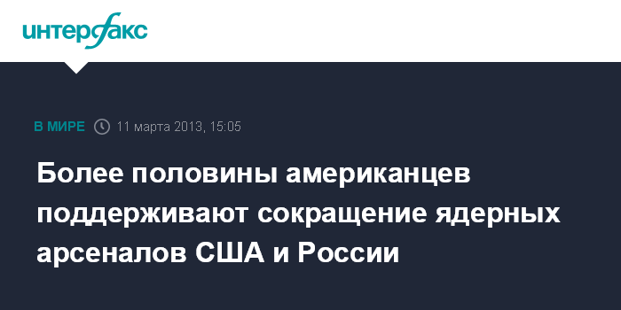 Вашингтон. 11 марта. INTERFAX.RU - Проголосовать за соглашение о сокращении ядерных вооружений со стороны США и России готовы 56% американцев, свидетельствуют результаты опроса центра Gallup, поступившие в "Интерфакс" в понедельник.