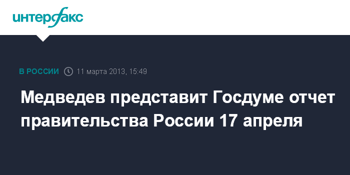 Горки. 11 марта. INTERFAX.RU - Премьер-министр России Дмитрий Медведев 17 апреля выступит перед Госдумой России с отчетом правительства.