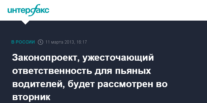 Москва. 11 марта. NTERFAX.RU - Госдума во вторник рассмотрит в первом чтении законопроект, ужесточающий ответственность за пьянство за рулем.