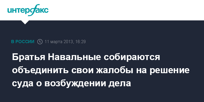 "Мы хотим объединить жалобы А.Навального и О.Навального в одно производство. Жалоба О.Навального уже была рассмотрена Басманным судом, однако сам заявитель не был должным образом извещен о заседании. Сейчас мы намерены восстановить срок обжалования в районном суде из-за этого нарушения, а затем объединенную жалобу рассмотреть в кассационной инстанции", - сказала она "Интерфаксу".